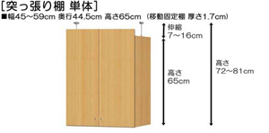 • 上置き棚奥深転倒防止対策A3 高さ72~81cm幅45~59cm奥行44.5cm(本体奥行46cm用) 扉付き商品の棚の様子 突っ張り棚扉付き 突っ張り棚高さ図 寸法図