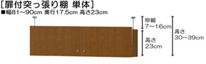 • 上置き棚薄型突っ張り奥深 高さ30~39cm幅81~90cm奥行17.5cm(本体奥行19cm用) 扉付き商品の棚の様子 突っ張り棚扉付き 突っ張り棚高さ図 寸法図