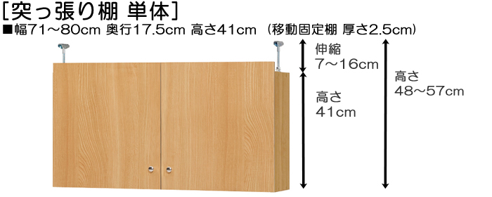 • 上置き棚薄型天井突張り奥深 高さ48~57cm幅71~80cm奥行17.5cm(棚板厚み2.5cm)(本体奥行19cm用) 扉付き商品の棚の様子 突っ張り棚扉付き 突っ張り棚高さ図 寸法図