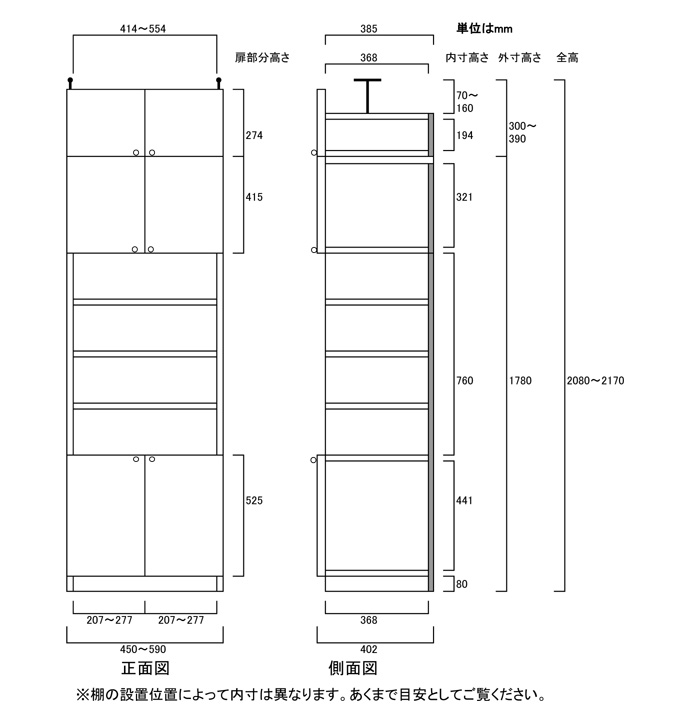 - ■上棚高さ高さ23cm+伸縮突っ張り金具(扉付き)