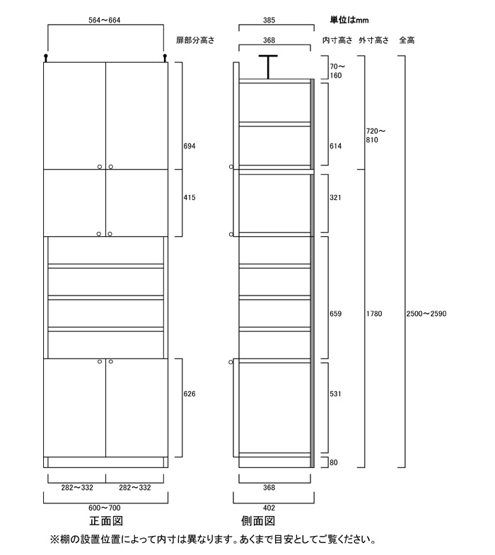 - ■外寸奥行40cm×高さ250~259cm×幅60~70cm(幅は1cm単位でオーダーできます)