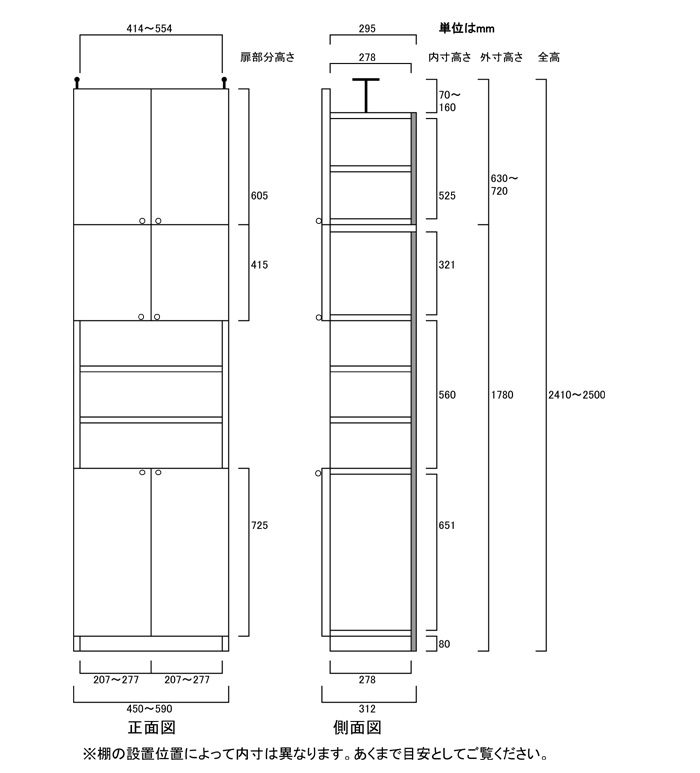 - ■上棚高さ高さ56cm+伸縮突っ張り金具(扉付き)