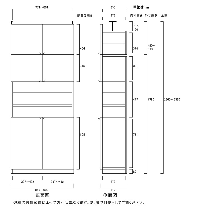 - ■上棚高さ高さ41cm+伸縮突っ張り金具(扉付き)