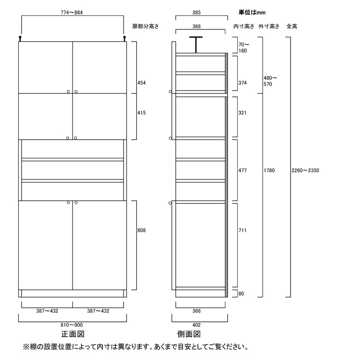 - ■上棚高さ高さ41cm+伸縮突っ張り金具(扉付き)