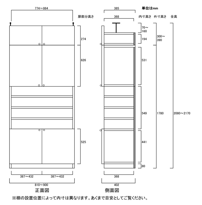 - ■上棚高さ高さ23cm+伸縮突っ張り金具(扉付き)