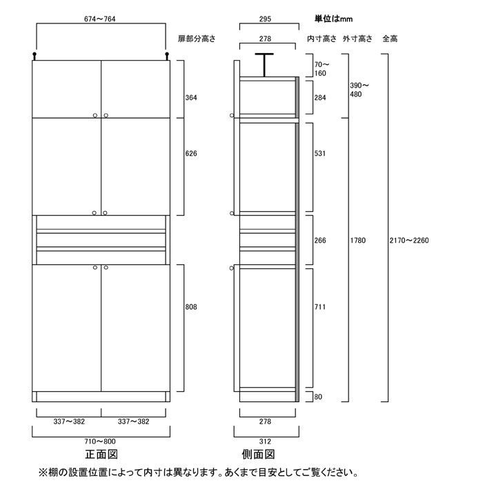 - ■上棚高さ高さ32cm+伸縮突っ張り金具(扉付き)