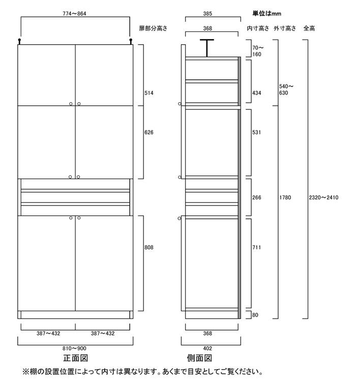 - ■上棚高さ高さ47cm+伸縮突っ張り金具(扉付き)
