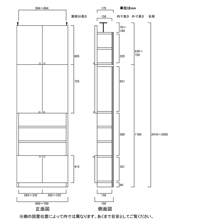 - ■上棚高さ高さ56cm+伸縮突っ張り金具(扉付き)