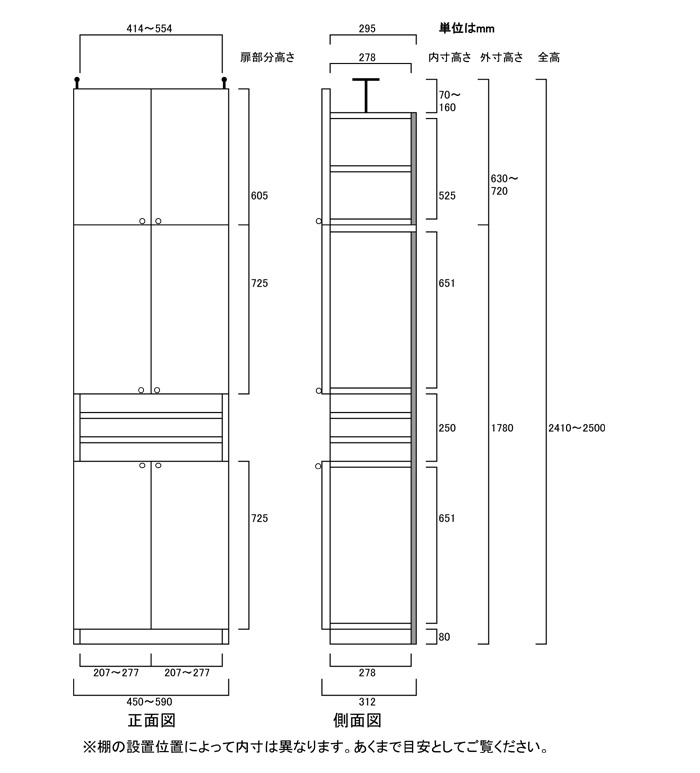 • ■上棚高さ高さ56cm+伸縮突っ張り金具(扉付き)