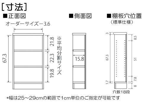 | ■外寸 | 奥行19cm×高さ80cm×幅25〜29cm (幅は1cm単位でオーダーできます) |