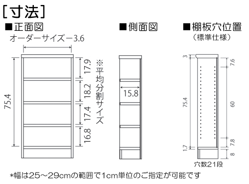 | ■外寸 | 奥行19cm×高さ88.1cm×幅25〜29cm (幅は1cm単位でオーダーできます) |