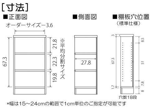 | ■外寸 | 奥行31cm×高さ80cm×幅15〜24cm (幅は1cm単位でオーダーできます) |
