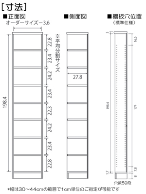 | ■外寸 | 奥行31cm×高さ211.1cm×幅30〜44cm (幅は1cm単位でオーダーできます) |
