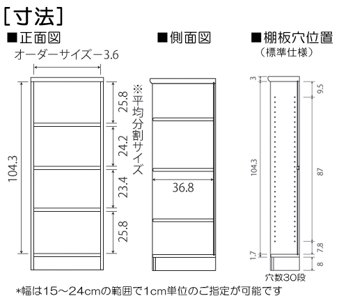 | ■外寸 | 奥行40cm×高さ117cm×幅15〜24cm (幅は1cm単位でオーダーできます) |