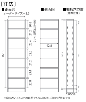 | ■外寸 | 奥行46cm×高さ178cm×幅25〜29cm (幅は1cm単位でオーダーできます) |