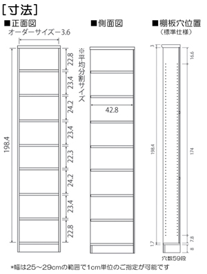 | ■外寸 | 奥行46cm×高さ211.1cm×幅25〜29cm (幅は1cm単位でオーダーできます) |