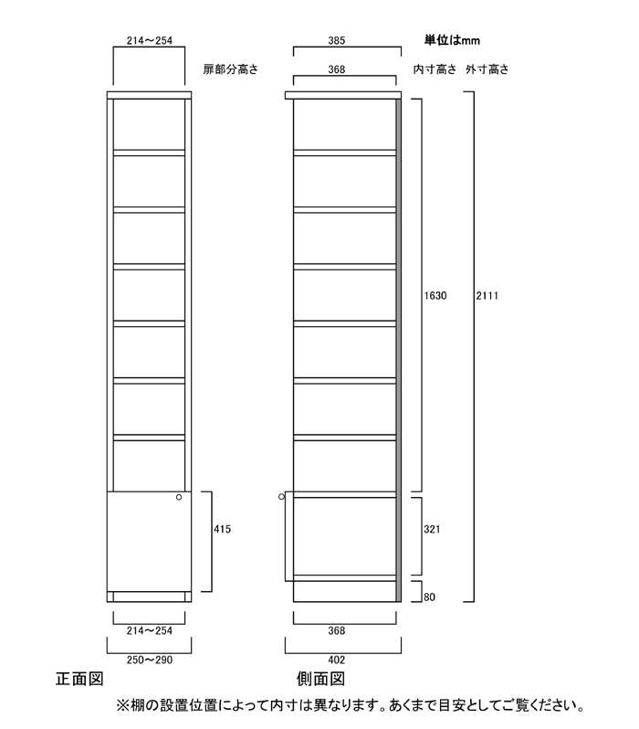 | ■外寸 | 奥行40cm×高さ211.1cm×幅25〜29cm (幅は1cm単位でオーダーできます) |