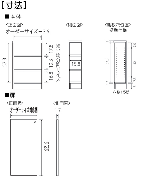 | ■外寸 | 奥行19cm×高さ70cm×幅30〜44cm (幅は1cm単位でオーダーできます) |