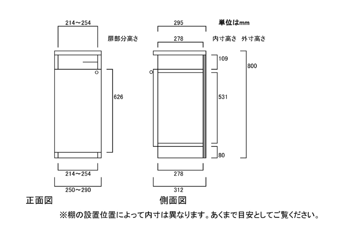 | ■外寸 | 奥行31cm×高さ80cm×幅25〜29cm (幅は1cm単位でオーダーできます) |