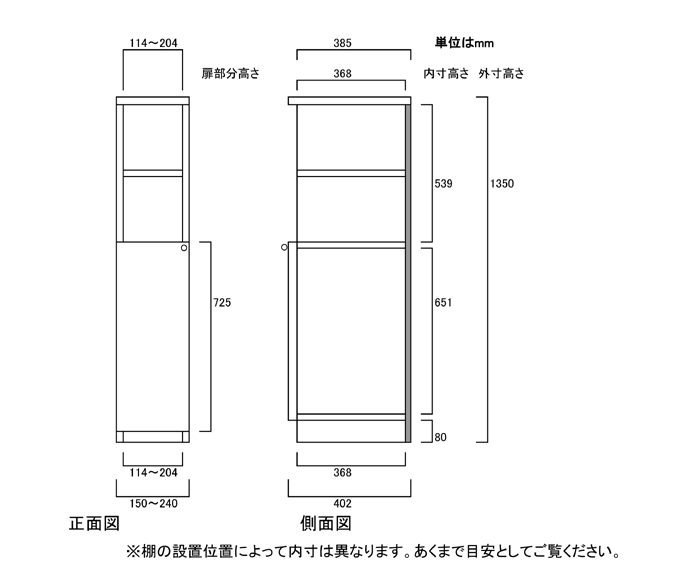 | 扉高41.5cm | 扉高52.5cm | 扉高62.6cm | 扉高72.5cm | 扉高80.8cm | |||||||
