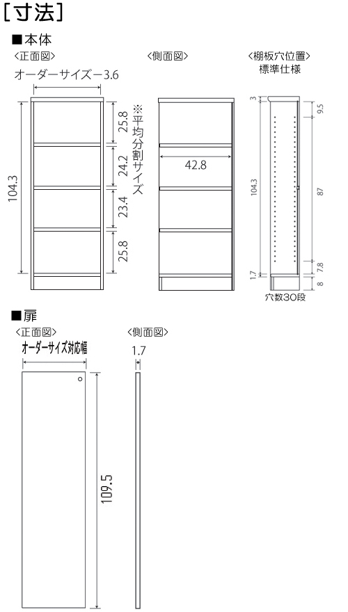| ■外寸 | 奥行46cm×高さ117cm×幅30〜44cm (幅は1cm単位でオーダーできます) |