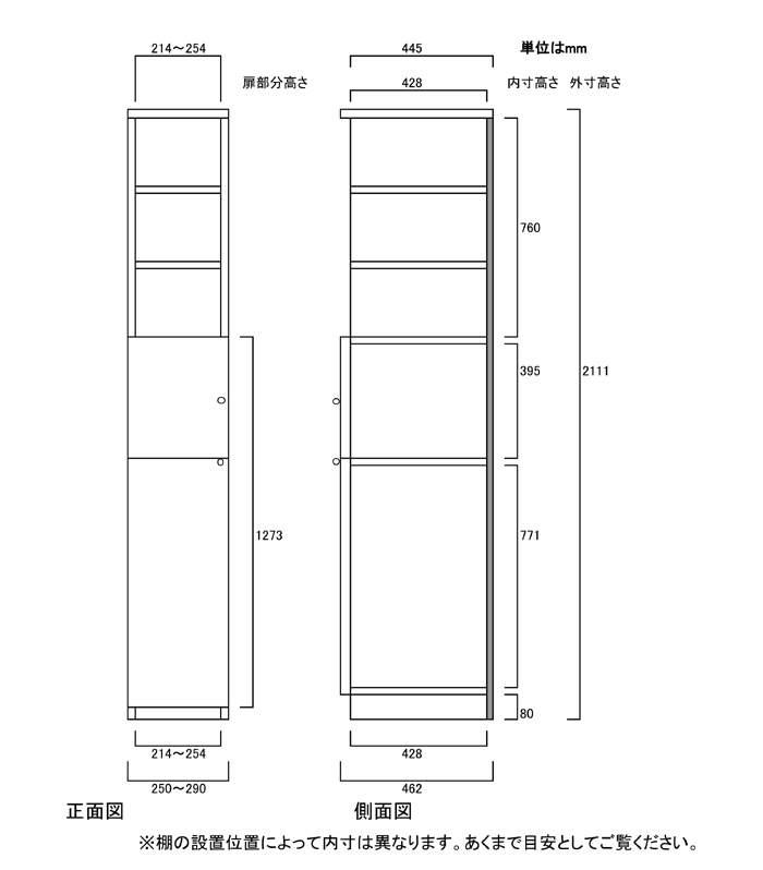 | ■外寸 | 奥行46cm×高さ211.1cm×幅25〜29cm (幅は1cm単位でオーダーできます) |