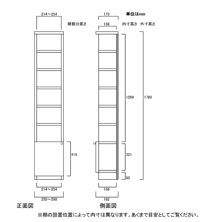 | ■外寸 | 奥行19cm×高さ178cm×幅25〜29cm (幅は1cm単位でオーダーできます) |