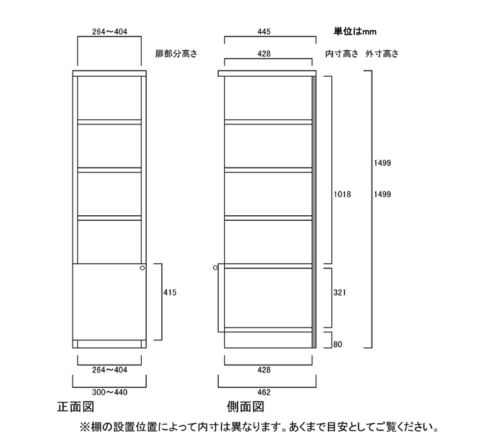 | 扉高41.5cm | 扉高52.5cm | 扉高62.6cm | 扉高72.5cm | 扉高80.8cm | |||||||