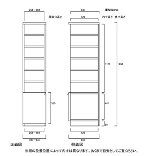 | ■外寸 | 奥行46cm×高さ178cm×幅30〜44cm (幅は1cm単位でオーダーできます) |