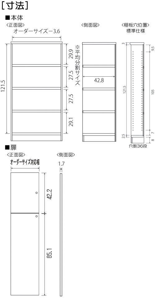 | ■外寸 | 奥行46cm×高さ135cm×幅30〜44cm (幅は1cm単位でオーダーできます) |