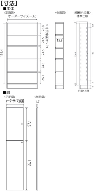 | ■外寸 | 奥行19cm×高さ149.9cm×幅30〜44cm (幅は1cm単位でオーダーできます) |