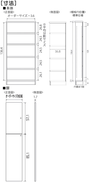| ■外寸 | 奥行40cm×高さ149.9cm×幅15〜24cm (幅は1cm単位でオーダーできます) |