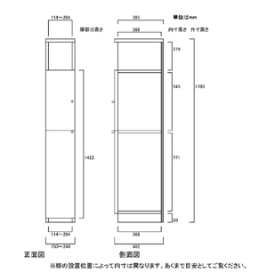 | ■外寸 | 奥行40cm×高さ178cm×幅15〜24cm (幅は1cm単位でオーダーできます) |