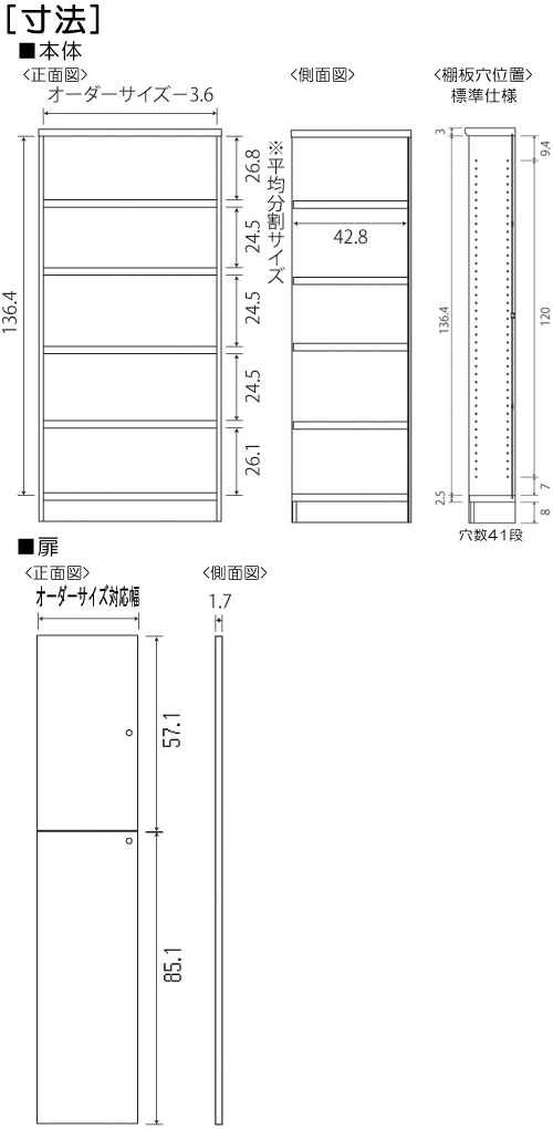 | 本体扉 幅15〜44cmは片開き扉(右開き・左開きをご選択) 高さ135cm以上は上下分割扉 |