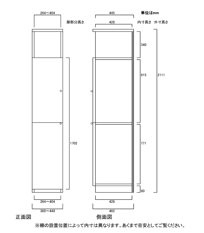 | 扉高41.5cm | 扉高52.5cm | 扉高62.6cm | 扉高72.5cm | 扉高80.8cm | |||||||