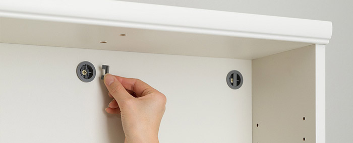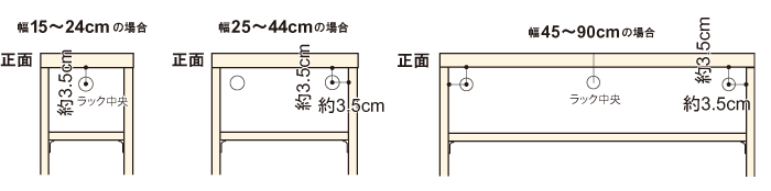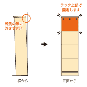 | 壁面固定補助具用穴加工はラックを壁面に固定するための壁面固定補助具用の穴を裏板に加工します。特にスリムタイプや扉付きタイイプにはおすすめします。※転倒防止を補助するための部品で、地震などの大きな揺れには対応しません。 |