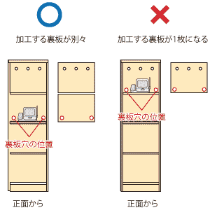 | ・1枚の裏板に「壁面固定補助具用穴加工」と「配線穴加工」を同時に加工頂けません。 |